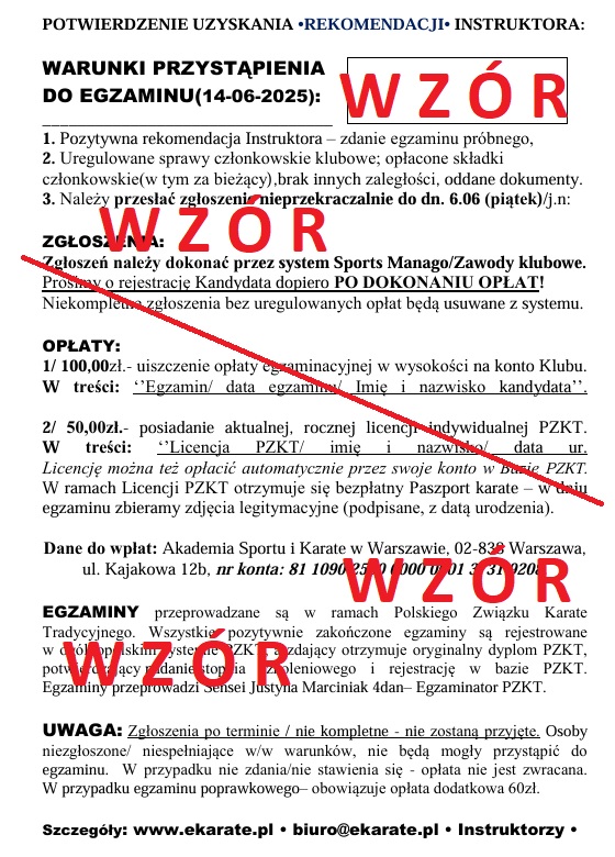 2/ Rekomendację Instruktora można uzyskać w dniach 17.11 – 8.12. 2025r. Wtedy odbędą się przygotowania do egzaminów i egzaminy próbne na regularnych grupach,