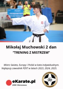 mamy przyjemność zaprosić Was na wyjątkowe wydarzenie – Trening z aktualnym Mistrzem świata, Europy i Polski w kata indywidualnym – Mikołajem Muchowskim 2 dan, zawodnikiem Kadry Narodowej Polskiego Związku Karate Tradycyjnego (PZKT). Sensei Mikołaj jest aktualnie 3 rok z rzędu najlepszym zawodnikiem PZKT w konkurencji kata indywidualne (forma).