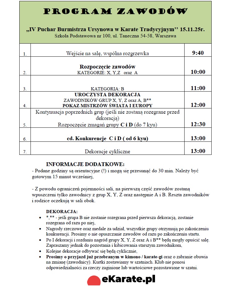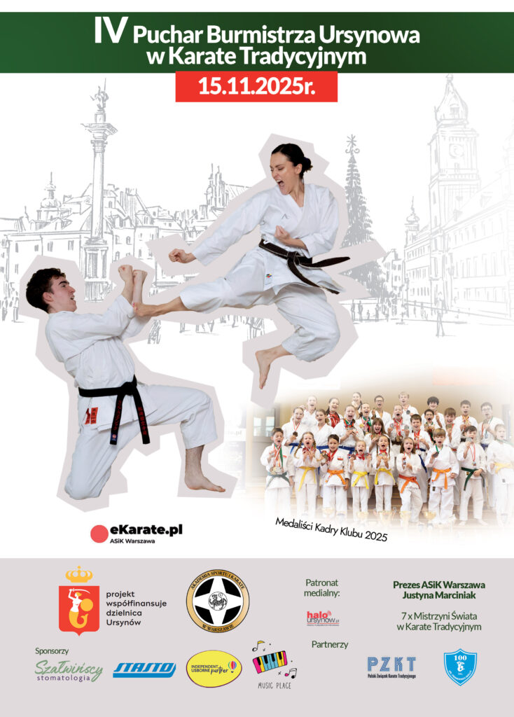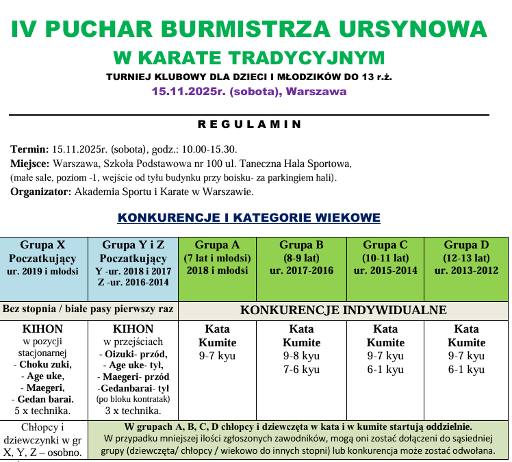 zapraszamy wszystkich naszych Klubowiczów do 13.r.ż. (bez względu na staż treningowy i stopień zaawansowania) do udziału w zawodach organizowanych przez nasz Klub pod nazwą ”IV Puchar Burmistrza Ursynowa w Karate Tradycyjnym”. Turniej odbędzie się 15 listopada b.r. w Szkole Podstawowej nr 100 przy ul. Tanecznej, od godziny 10:00. Przewidziane są konkurencje dla zupełnie początkujących – Pierwszy Krok (gimnastyczne i techniki podstawowe w miejscu – kihon!).